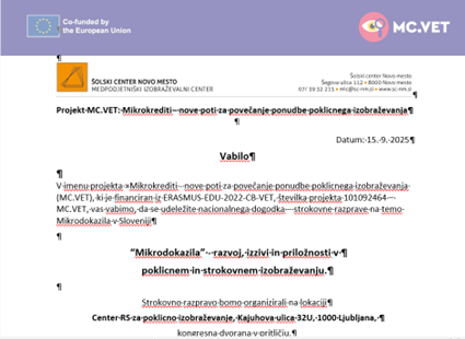 v okviru projekta MC.VET: Mikrokrediti - nove poti za povečanje ponudbe poklicnega izobraževanja vas vabimo, da se udeležite nacionalnega dogodka