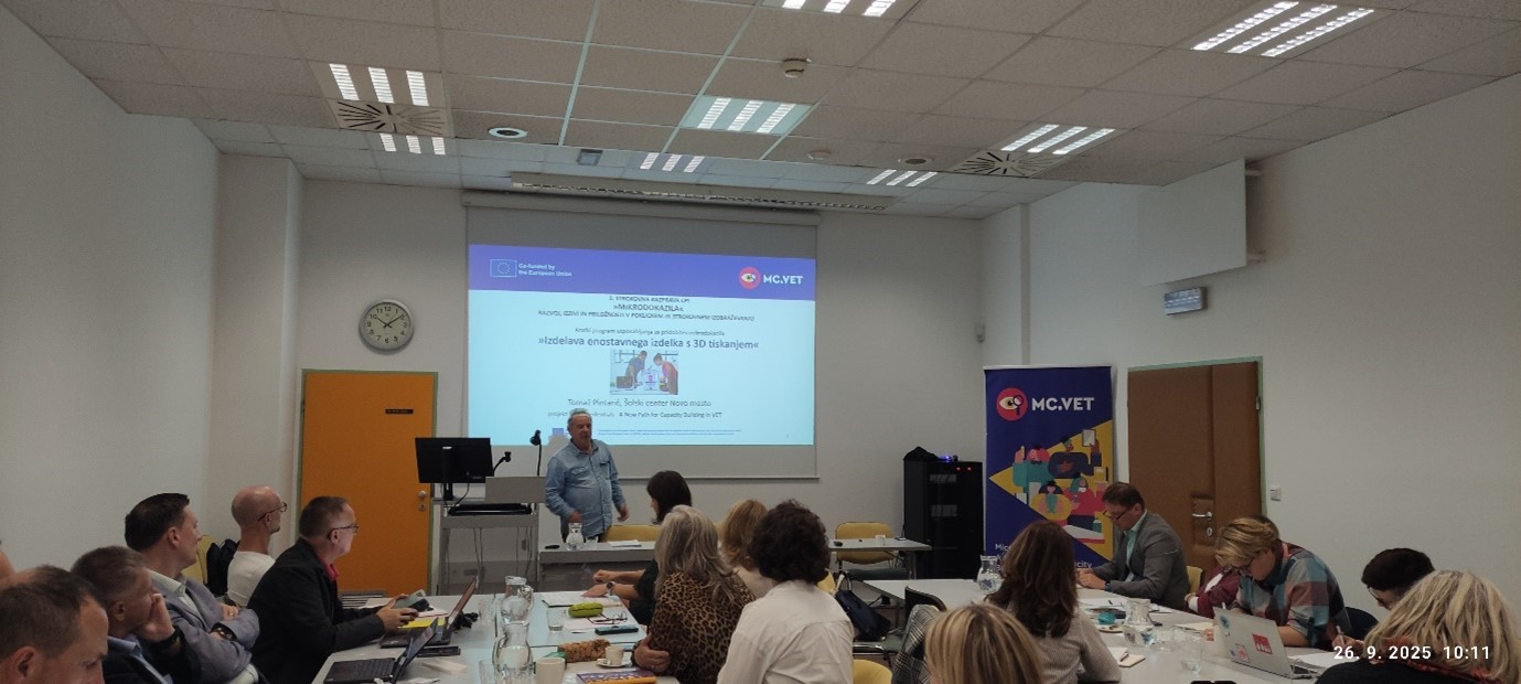 Tomaž Pintarič (Šolski center Novo mesto) je v okviru projekta MC.VET: Mikrokrediti – nove poti za povečanje ponudbe poklicnega izobraževanja predstavil program usposabljanja za pridobitev mikrodokazila Izdelava enostavnih izdelkov s 3D tiskanjem.