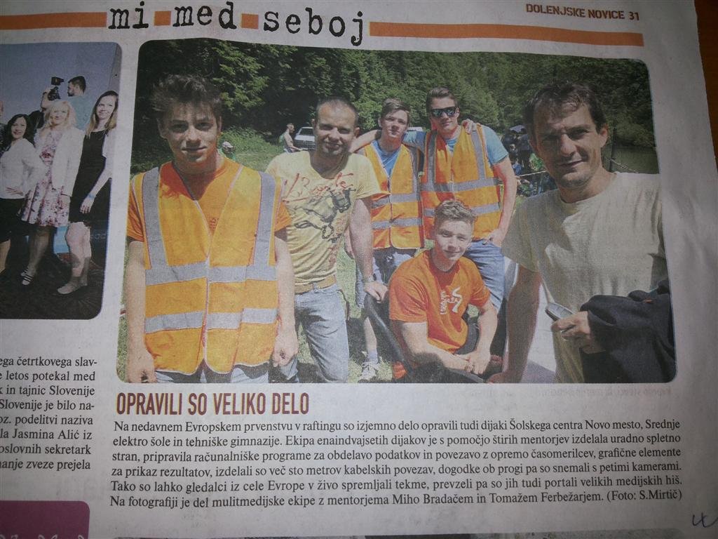 Multimedijski krožek Srednje elektro šole in tehniške gimnazije na Šolskem centru Novo mesto omogoča dijakom vseh izobraževalnih programov (elektrotehnikom, tehnikom računalništva in dijakom tehniške gimnazije) razširjene vsebine s področja multimedije. Svoje izkušnje si nabirajo s snemanji koncertov, športnih tekmovanj v dvorani Leona Štuklja, Novomeškega teka in podobno. S svojimi prenosi v živo so se izkazali in bili povabljeni k organizaciji Evropskega prvenstva v raftingu 2016. Izkazali so se v strokovnosti, vnemi in sposobnosti timskega dela: štiri dni v Tacnu, dva v Zagradcu, ob soncu, vetru in dežju, s polnim kombijem tehnične opreme, ki je morala delovati. Bili so v stalni interakciji z organizatorji, časomerilci in mednarodnimi sodniki. To je za ekipo dvajsetih dijakov in mentorjev predstavljalo prvovrsten izziv. Izdelava uradne spletne strani prvenstva, elektronska obdelava podatkov, zajem rezultatov iz opreme časomerilcev, grafična oprema prenosa, zajem in obdelava zvoka, koordinacija petih kamer in video-montaža, postavitev žičnih in brezžičnih povezav, pretvornikov - vse to je pripeljalo do končnega produkta, neposredne pretočne vsebine (video streaming) preko portala YouTube. Večina gledalcev prenosa je bilo iz tujine, povzemale so ga tudi nekatere velike medijske hiše, od katerih so dobili veliko pohval. Nenazadnje so bili naši posnetki odličen pripomoček sodnikom, ki so ob našem monitorju pogosto staknili glave in odločali o napakah tekmovalcev. Naj zaključimo s pohvalo vodje sodniške ekipe: "You guys, you really did a great job".Promocijski video "Behind the scenes" je posnel iz zmontiral Erazem Gliha, T3a.