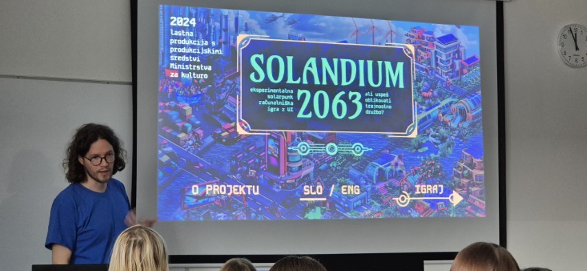 Nejc je novomedijski ustvarjalec, ki se ukvarja z umetnostjo in umetno inteligenco. V času svojega udejstvovanja je s pomočjo umetne inteligence ustvaril igrico Solandium 2063, ki je eksperimentalna strateška 3D računalniška igra žanra solarpunk z vgrajeno umetno inteligenco. Igrica je postavljena v distopično prihodnost leta 2063, misija igralca pa je, da prek dialoga z UI snuje strategije za preobrazbo propadlega robotiziranega centra v ekološko skupnost. Delavnica je bila zasnovana zelo praktično, dijaki pa so sodelovali z velikim zanimanjem in radovednostjo. Ob koncu so poudarili, da so pridobili nova znanja, ideje in predvsem dodatno motivacijo za nadaljnje delo in ustvarjanje.