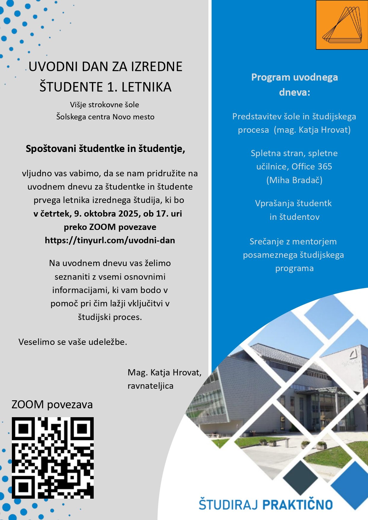 Vabljeni na uvodni dan za študente prvega letnika rednega študija, ki bo potekal v torek, 30. septembra 2025, ob 9.00 uri v predavalnici AP.1 v novem traktu Šolskega centra Novo mesto.